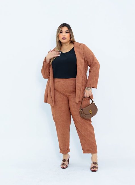 É um conjunto composto por blazer e calça com corte alfaiatado, confeccionados em malha polinho estruturada, que garante caimento impecável, toque macio e visual alinhado. A modelagem foi pensada especialmente para o corpo Plus Size, unindo elegância, conforto e versatilidade.